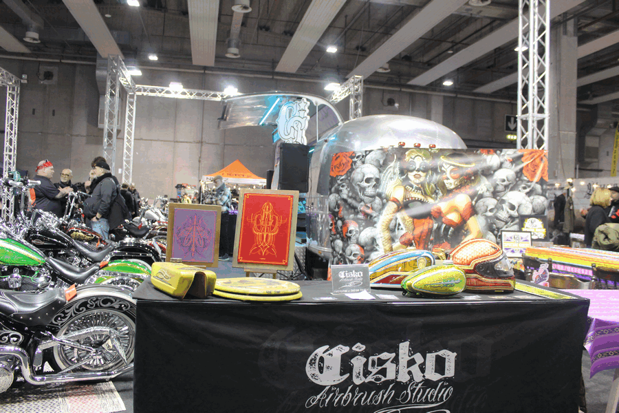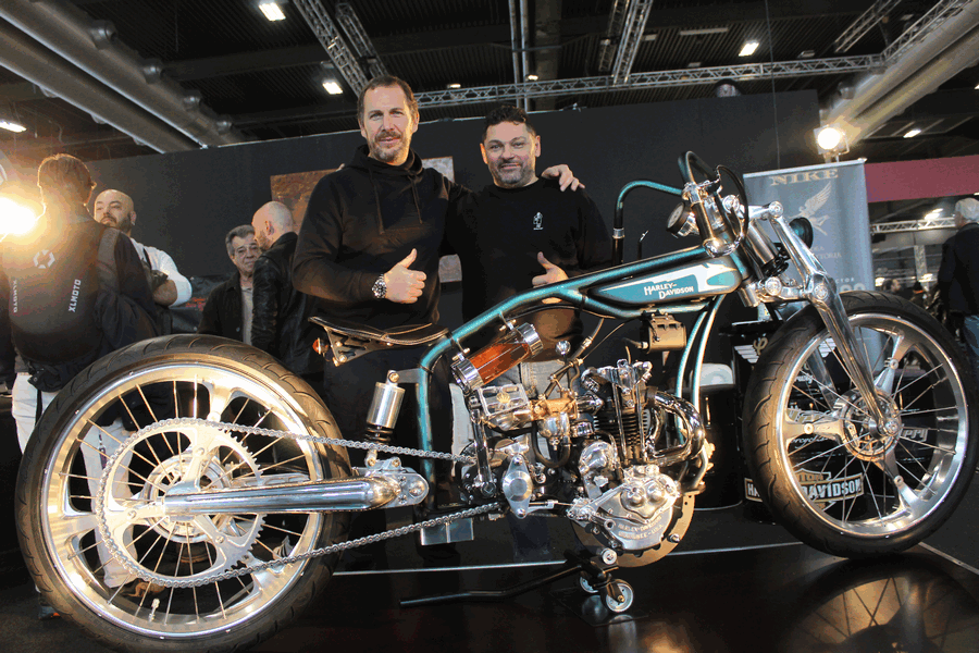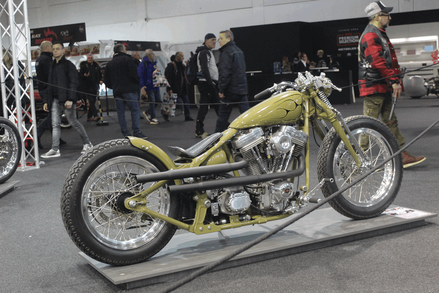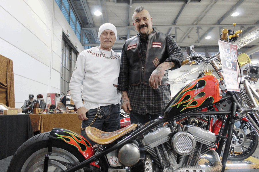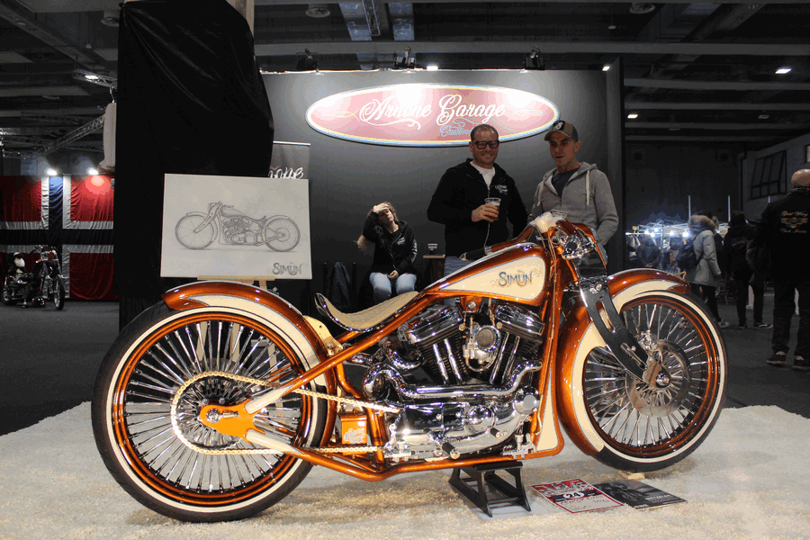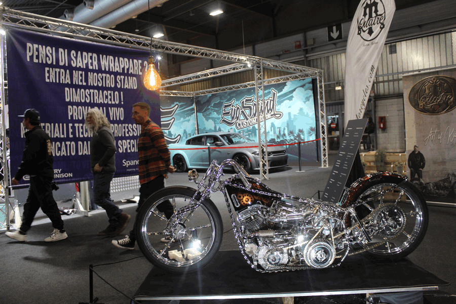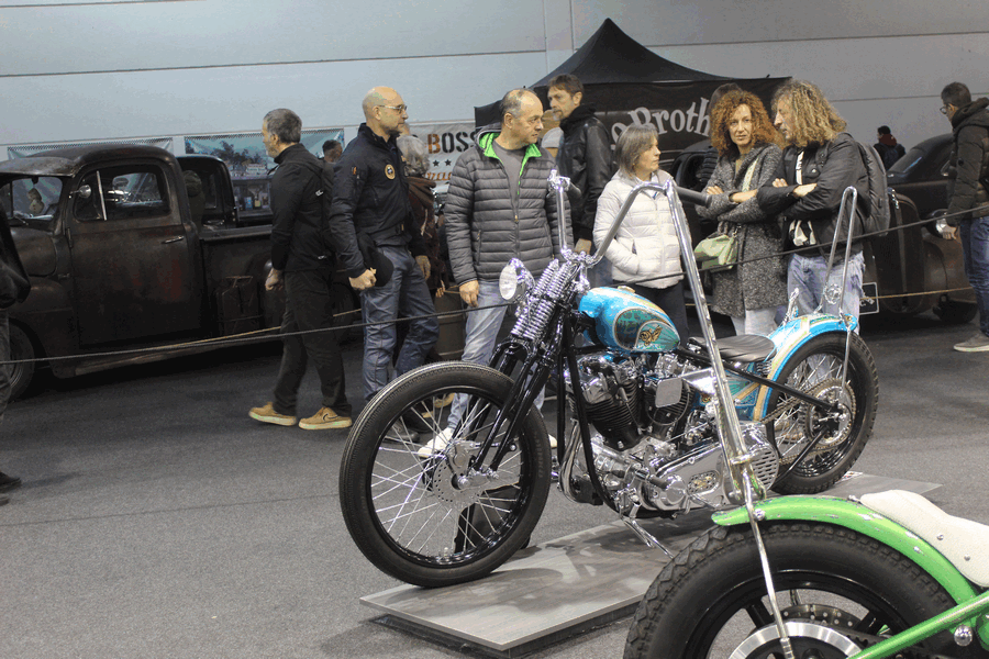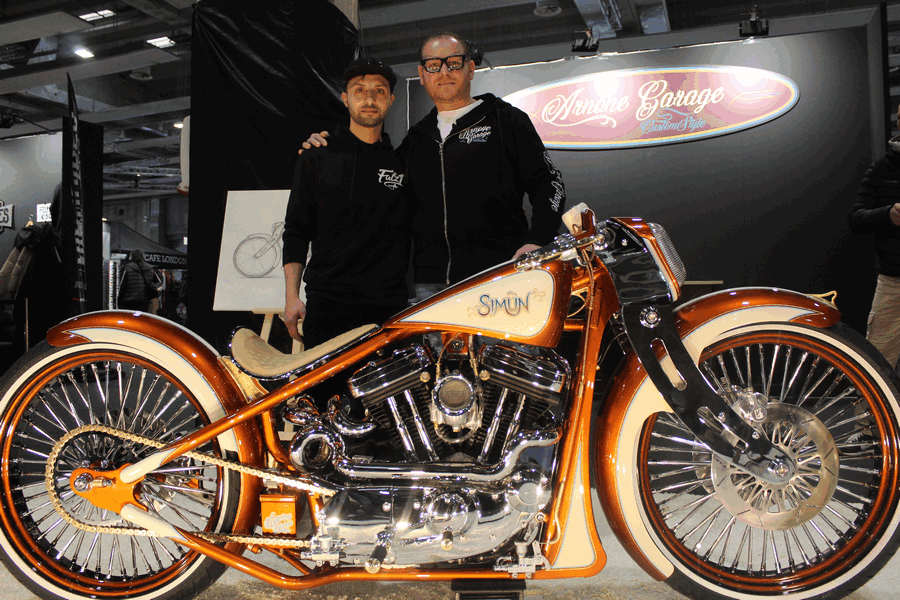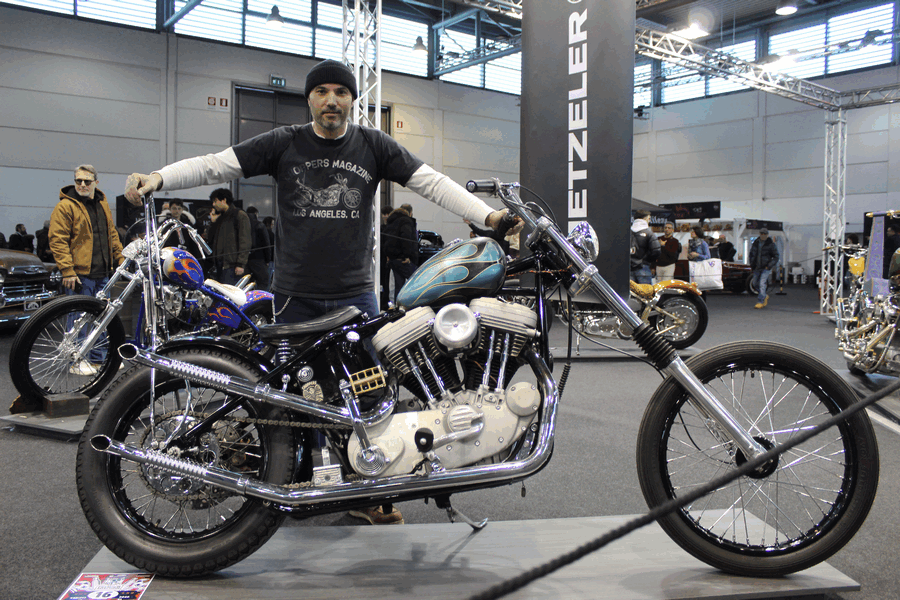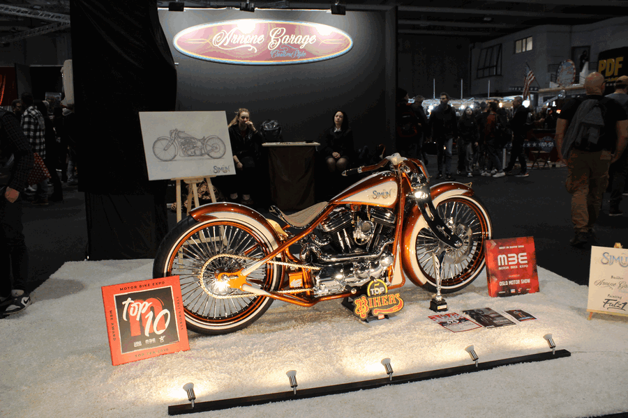 Girando nei vari padiglioni notiamo alcune nostre vecchie conoscenze: Niko Bikes porta a Verona la sua ultima realizzazione, un godibilissimo chopperino su telaio rigido, finemente impreziosito dalla mano di Cisko Airbrush. A poca distanza Giuseppe Arnone di Arnone Garage ci lascia a bocca aperta con Simun, motore H-D Sportster portato a 1.200cc incastonato in un telaio rigido, una forcella completamente hand made, ruota da 23” ed una verniciatura dai toni caldi di Dario Falzone. Moto che si è distinta nei vari contest di MBE.