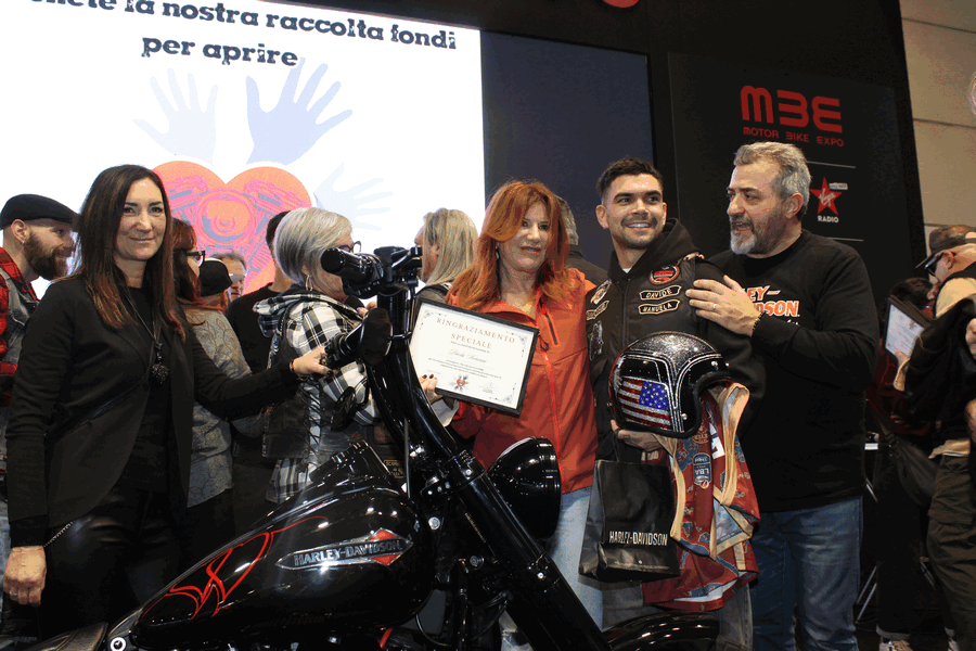 Particolarmente toccante l’iniziativa che ha visto il coinvolgimento degli Hog Chapter di Treviso, Bassano, Padova, Verona, Trento, Mantova e Bolzano svoltasi domenica pomeriggio. A luglio scorso morirono in un incidente stradale avvenuto a Jesolo i coniugi Davide a Manuela. Interpretando i desideri dei due figli, anch’essi harleisti, è nato un progetto “ricostruiamo la 1000” che voleva riportare in strada la moto dei loro genitori. A MBE i due ragazzi, inconsapevoli di quello che i chapter avevano organizzato a loro insaputa, erano venuti in fiera per trovare qualche pezzo di ricambio nei vari swap meet da utilizzare per cercare di sistemare la moto. La commozione e il loro stupore è stato grandissimo quando hanno scoperto che la moto è stata portata sul palco perfettamente sistemata e finita, abbracciati da tutte le persone che in qualche modo hanno contribuito generosamente e affettuosamente ha realizzare questo loro piccolo ma importante desiderio in onore dei genitori scomparsi a cui a breve verrà dedicata una fondazione a loro memoria.
